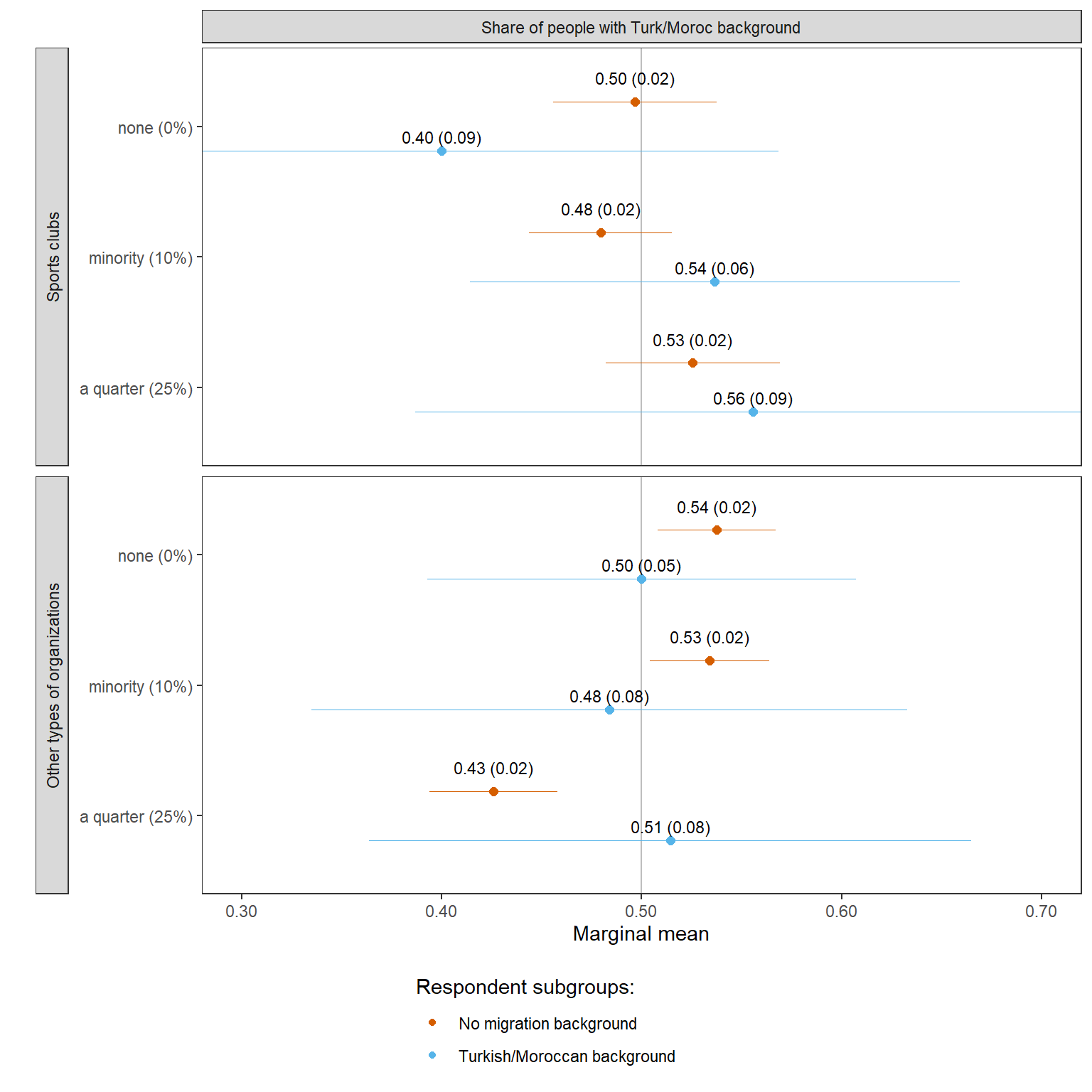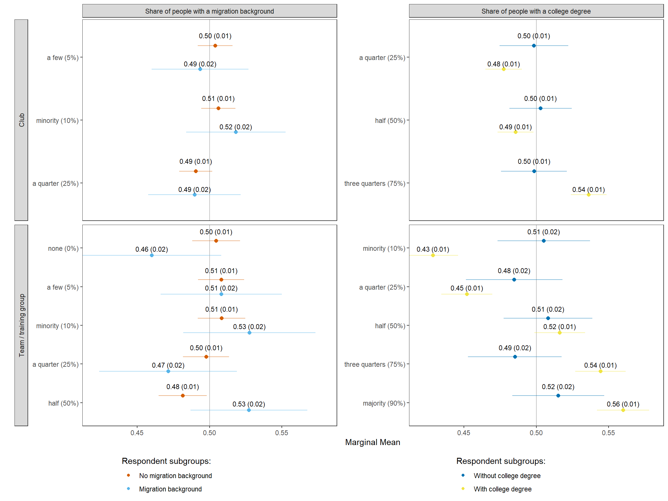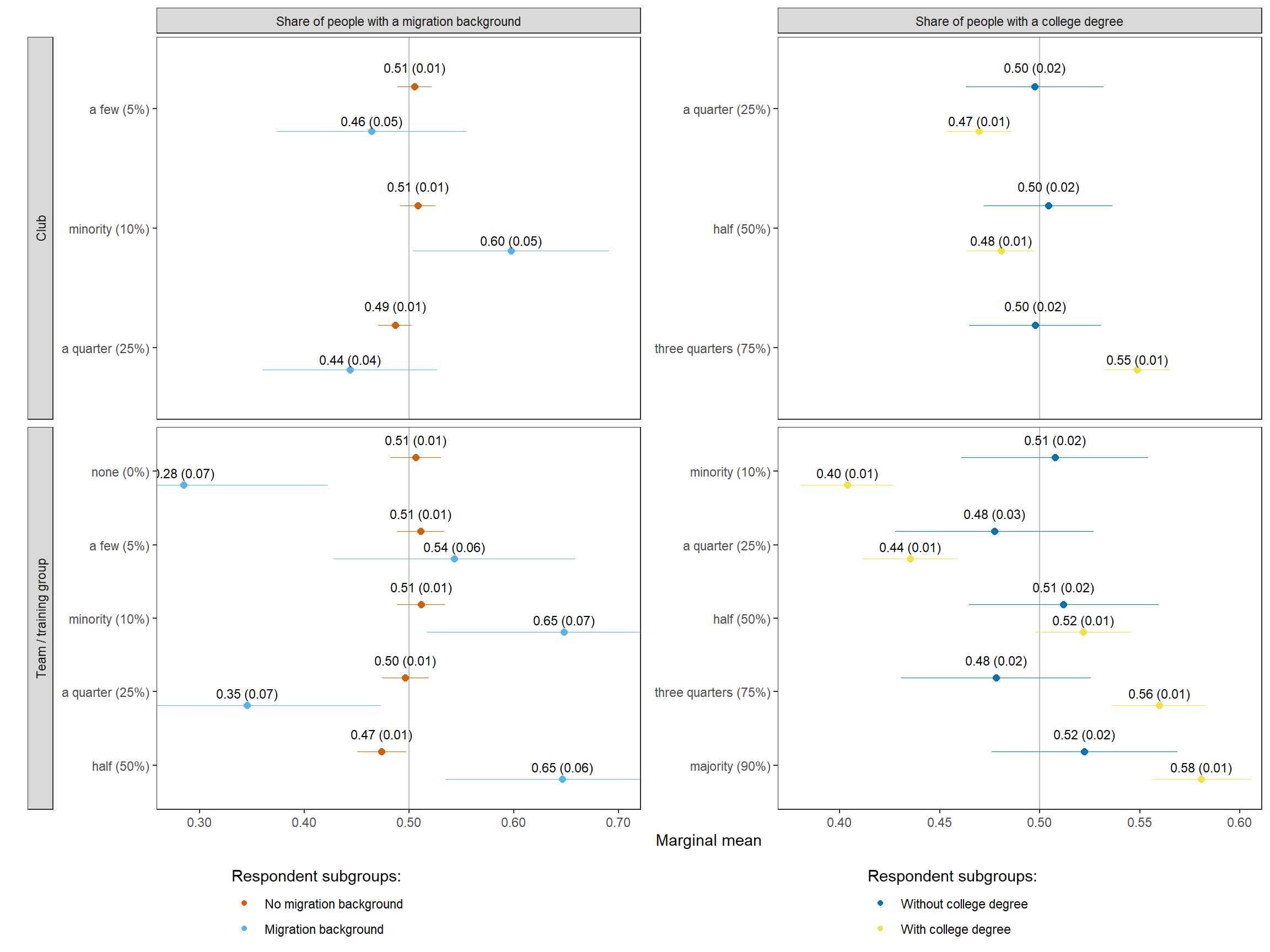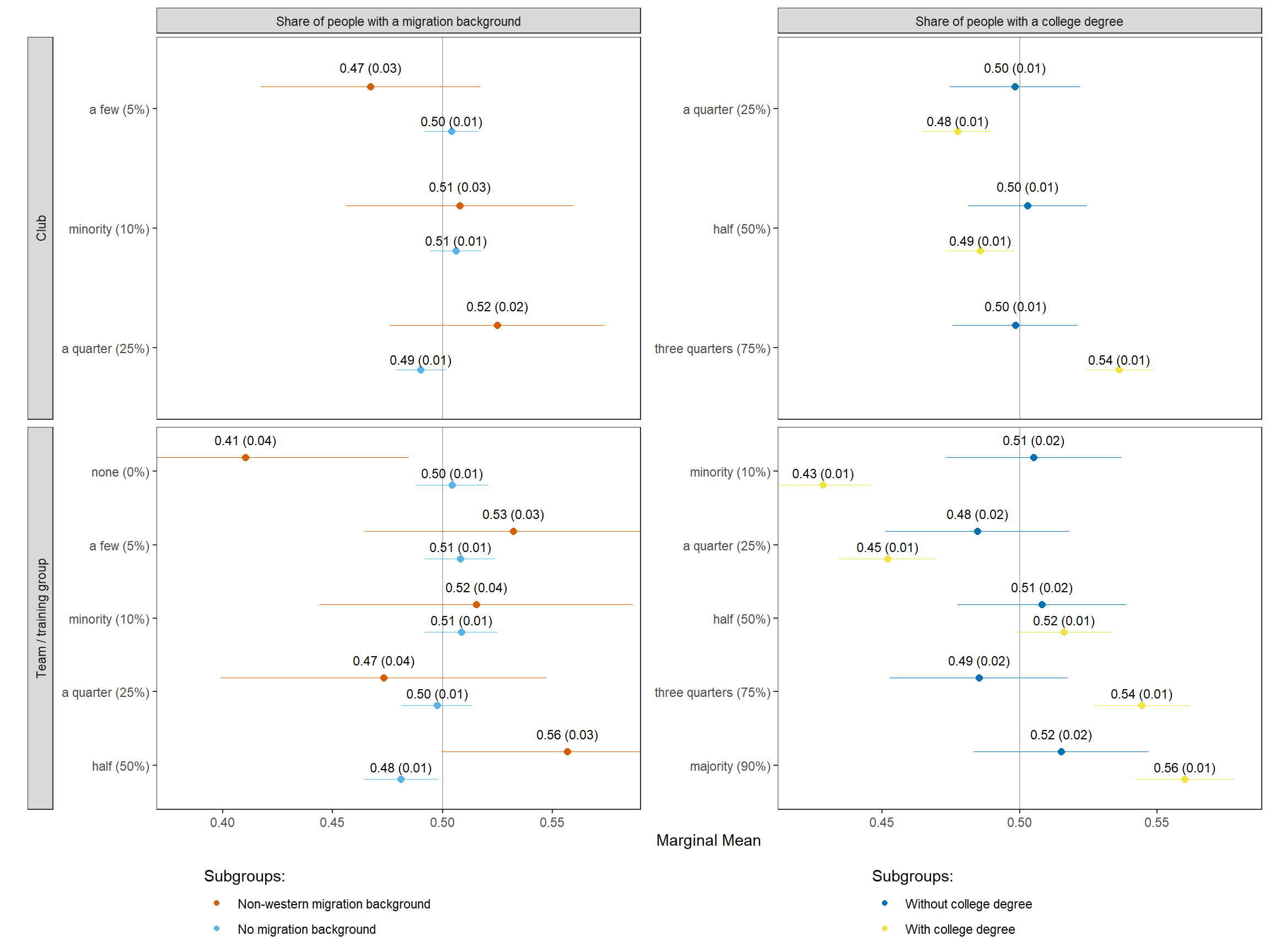 22 No migration background choice mm migrant_club club members with migration background: a few (5%) 0.51 0.01 82.18 0 0.49 0.52 Club Share of people with a migration background No migration background